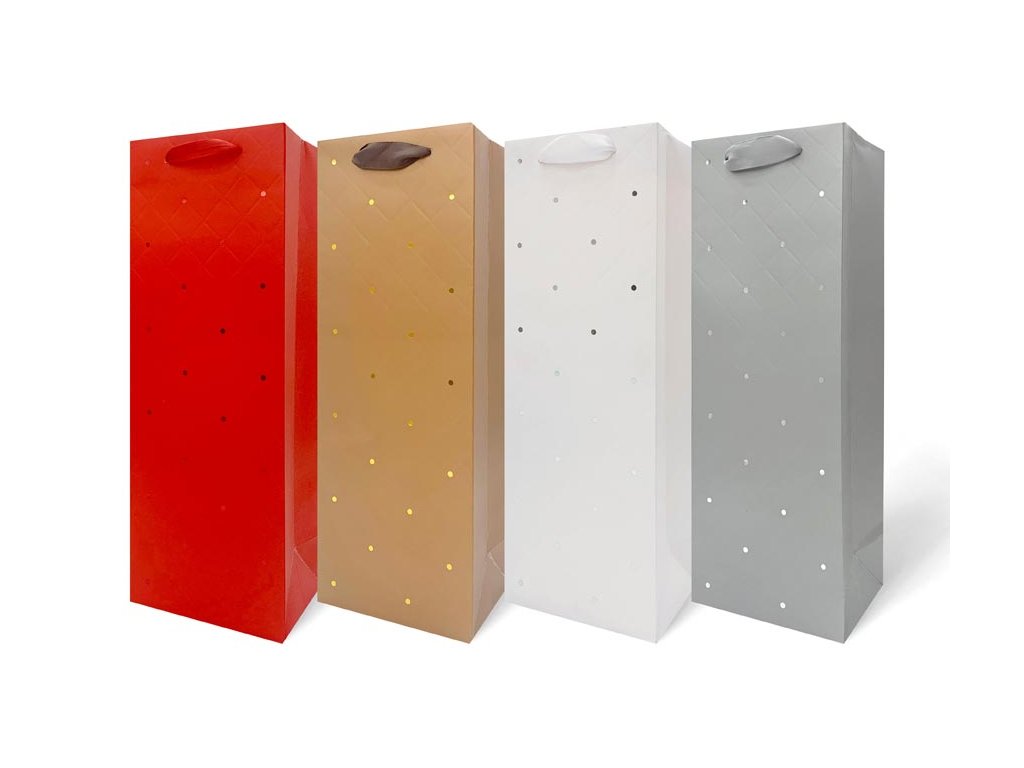 Papírová dárková taška na víno nebo jinou lahvinku. Taška je opatřena pevným uchem pro snadné nošení.
