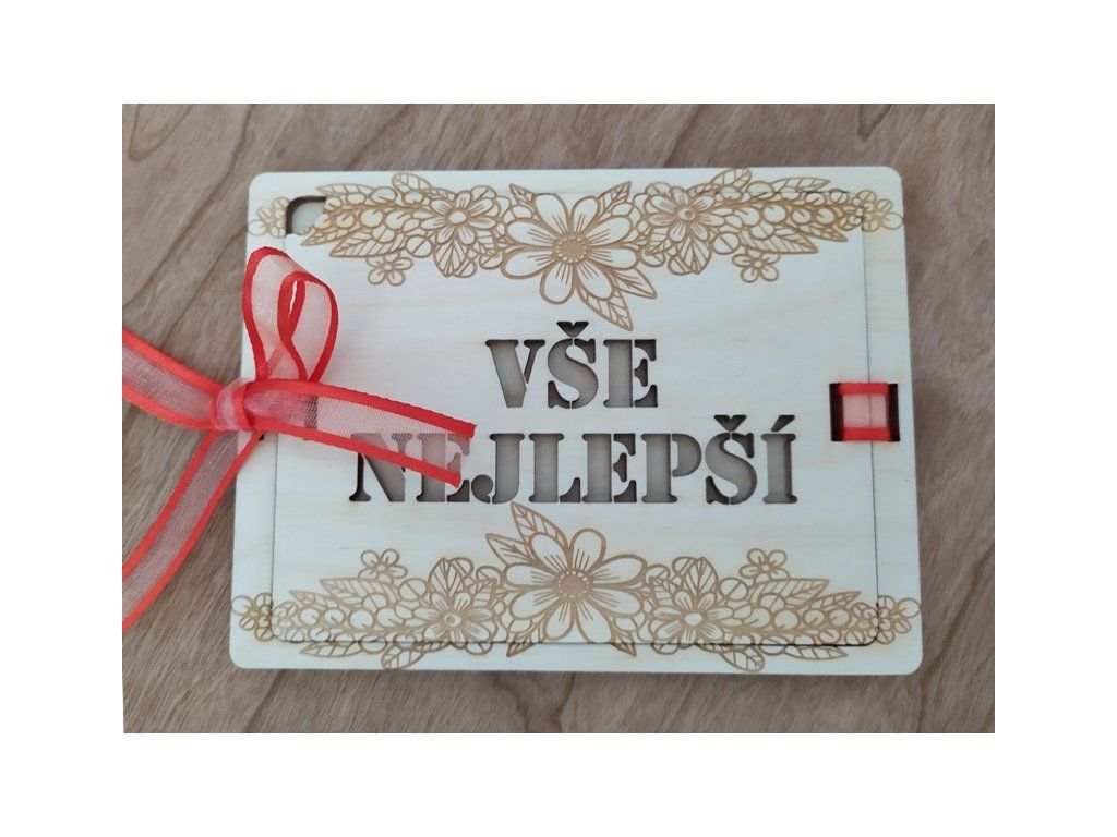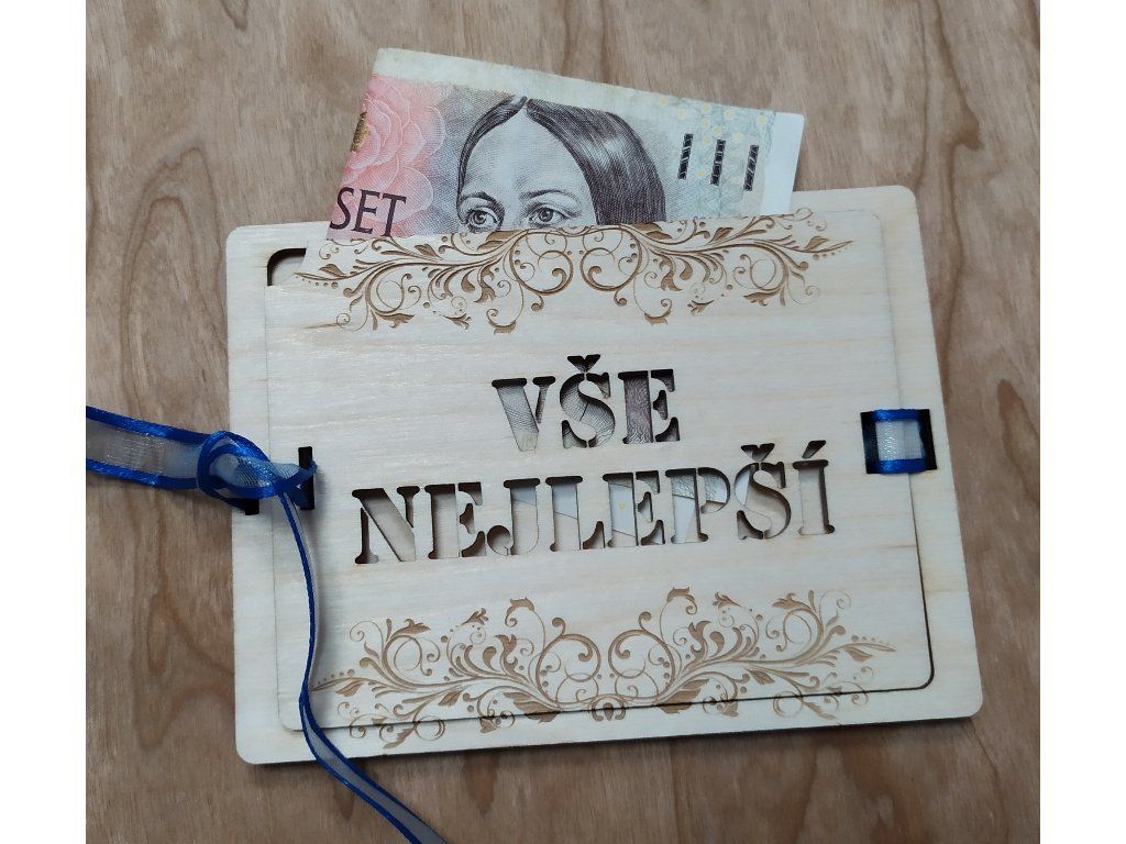 Bankovy prosvítají skrz průřezy VŠE NEJLEPŠÍ. Je ozdobena barevnou stuhou.