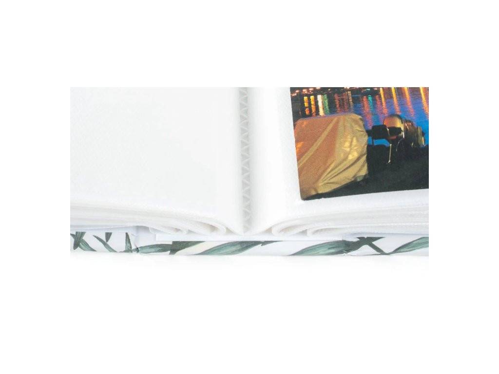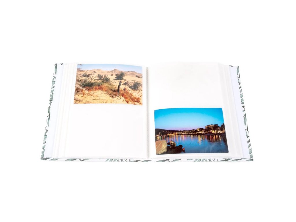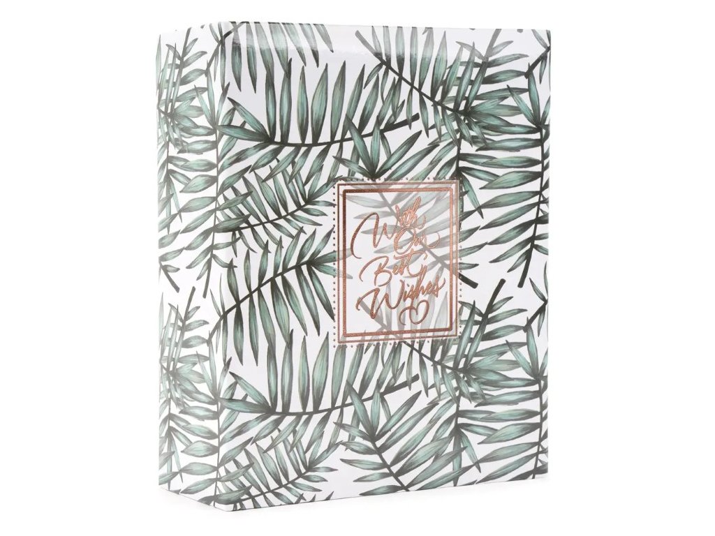 V tomto elegantním fotoalbu s motivem tropických listů si uchováte až 304 fotografií o rozměru 10 x 15 cm. Pevné desky z laminovaného papíru a svařovaná vazba zaručují odolnost a dlouhou životnost. Fotografie se vkládají do průhledných kapes (dvě nad sebe), díky čemuž jsou bezpečně chráněny a připraveny k rychlému prohlížení. Album je laděné do neutrálních zelených a bílých barev a je doplněno zlatým nápisem "Best Wishes". Skvěle poslouží k uložení vzpomínek z dovolené nebo jako stylový dárek.