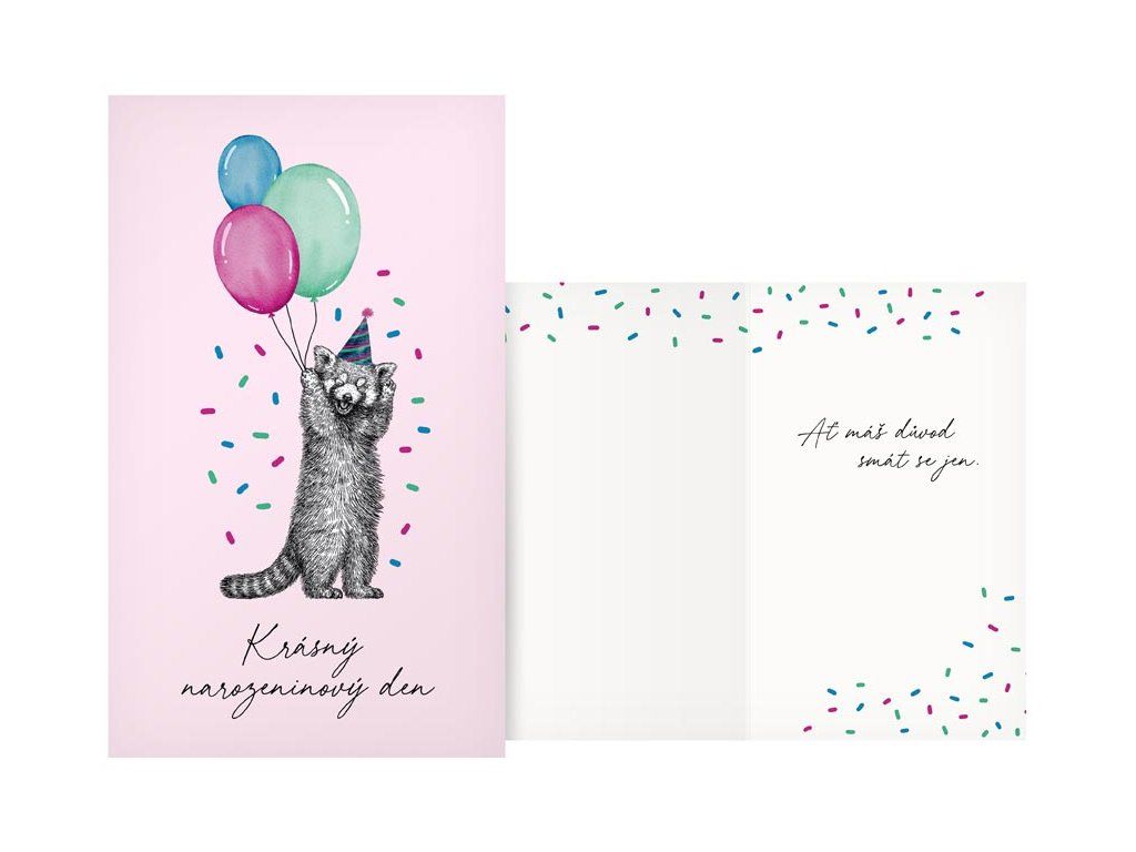 Text na přední straně:Krásnýnarozeninový denText uvnitř přání:Ať máš důvodsmát se jen.Papír: pohlednicový karton