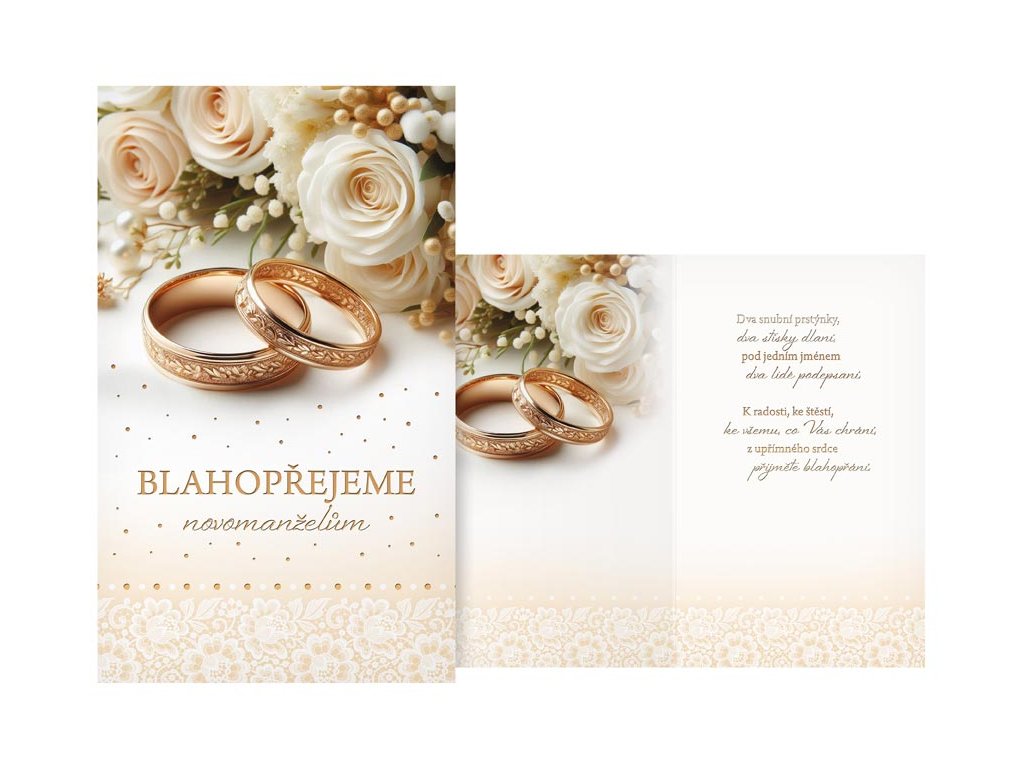 Svatební přání s motivem zlatých snubních prstenů a jemných krémových růží je perfektním způsobem, jak novomanželům vyjádřit své srdečné gratulace. Je ideální volbou pro každého, kdo chce věnovat elegantní a stylové přání, které zachycuje slavnostní atmosféru svatebního dne a oslavuje lásku novomanželů.