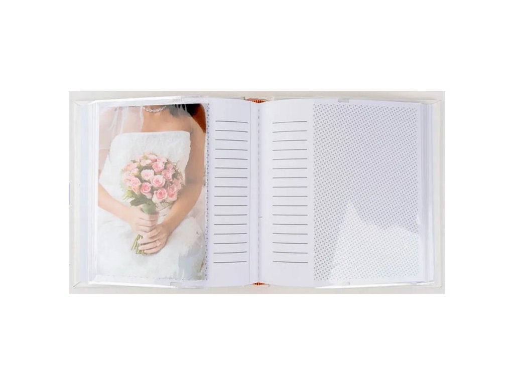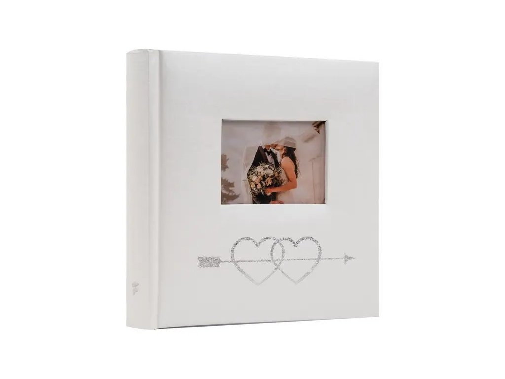 Jedná se o malé svatební fotoalbum s imitací kůže v čistě bílé barvě. Album má šitou vazbu, která zaručuje jeho dlouhou životnost. Je ideální pro uchování 50 fotografií formátu 10 x 15 cm, které se vkládají zasouváním. U každé fotografie je prostor pro popisky. Listy jsou vyrobeny z bílého papíru. Na obálce je vyobrazen motiv propojených srdcí probodnutých šípem ve stříbrné barvě, které symbolizují lásku. V horní části obálky je okénko pro vložení vlastní vyměnitelné fotografie (např. svatební fotografie), což dodává albu osobní ráz. Díky svému motivu a kompaktní velikosti je album skvělým dárkem nebo památkou na svatební cestu.